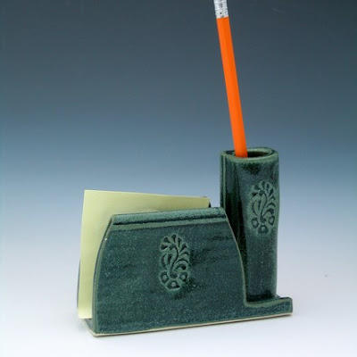 Charan at Creativewithclay has created a beautiful pen and notepad holder out of stoneware that would eliminate some of the clutter on your desktop or kitchen counter while at the same time providing an interesting focal point. A real steal at $12.